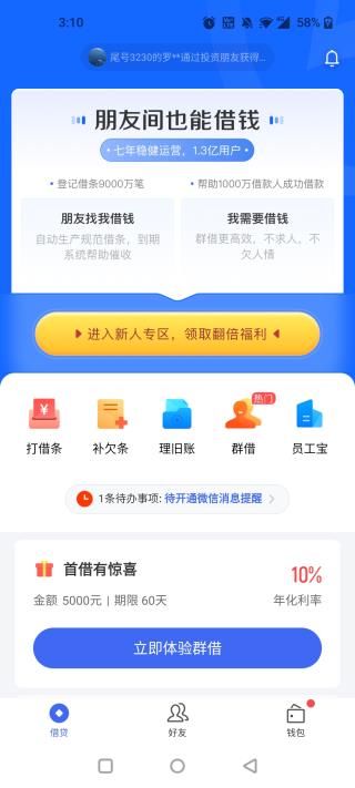 1、熟人借貸,所有交易都發(fā)生在朋友之間。借款人實(shí)名,出借人匿名,避免當(dāng)面開(kāi)口,朋友談錢不再尷尬。