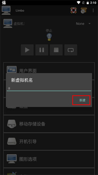 9、這里當(dāng)你點(diǎn)擊磁盤A后面的None時,會彈出小窗口,這里要選擇打開而不是New。New是新建一個空鏡像,而打開則是手機(jī)自帶或者limbo內(nèi)置的文件管理器,讓你選擇鏡像。