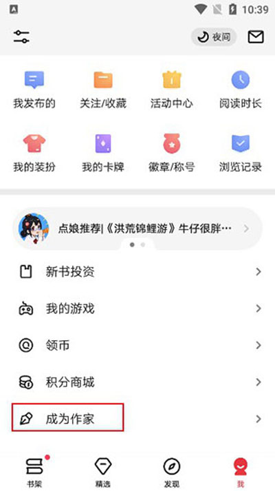 1、首先在手機(jī)上打開起點讀書app,點擊底部我——找到成為作家