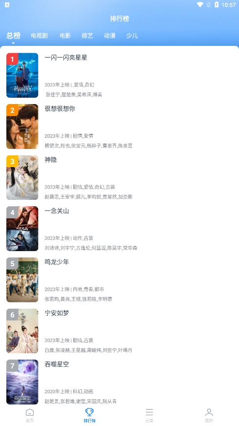 3、在排行榜頁面當(dāng)中,我們可以看到電視劇、電影、綜藝、動(dòng)漫、少兒等影視熱門排行榜。