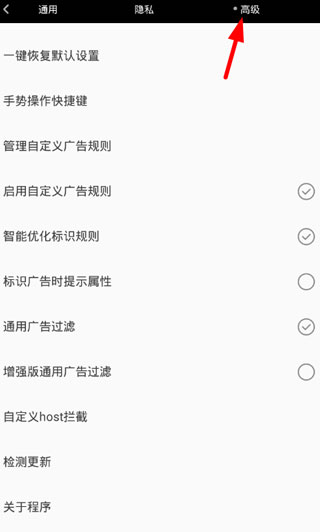 3、甚至你還可以進(jìn)入設(shè)置頁面中,通過高級選項(xiàng),對瀏覽器的網(wǎng)頁進(jìn)行廣告的過濾設(shè)置,提升自己的使用體驗(yàn)。