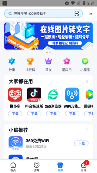 360手機助手是一款專為手機端用戶所打造的一款手機資源管理以及下載平臺。該軟件中擁有著海量的資源各種類型應(yīng)有盡有,如游戲、軟件、音樂、小說、視頻、圖片等資源,并且所有資源都是經(jīng)過360安全檢測,保證用戶下載的軟件絕對安全。軟件中還擁有著眾多福利,用戶在該軟件中能夠領(lǐng)取到各種話費、影視會員、購物優(yōu)惠券等。感興趣的朋友不妨下載試試吧!