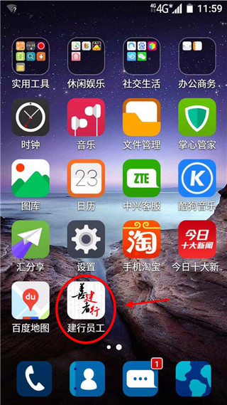 2、如下圖所示:點(diǎn)擊手機(jī)上的“建行員工”圖標(biāo)