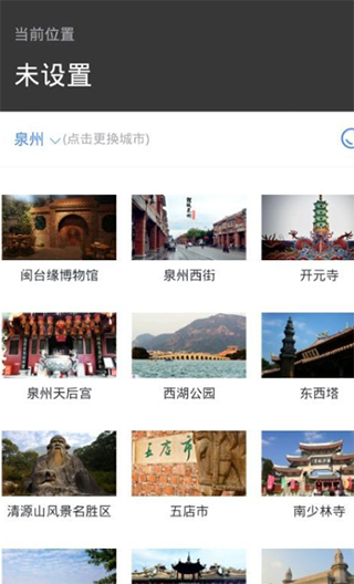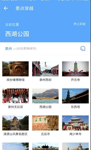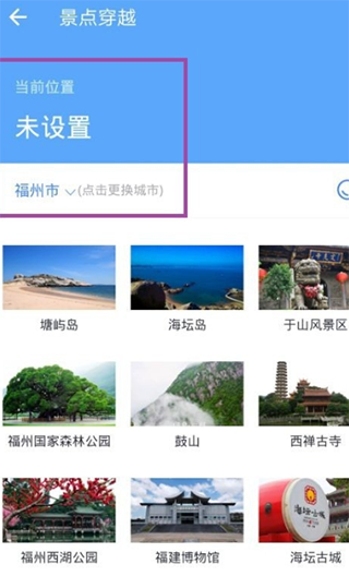 3、點(diǎn)擊進(jìn)入景區(qū)穿越頁面,可以看到我們目前的位置信息,默認(rèn)情況下是我們所在的城市。