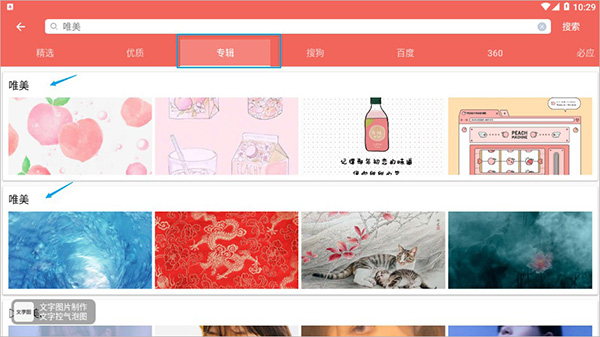 4、另外,你在搜索圖片的同時(shí),圖片大全搜圖神器還能鏈接到優(yōu)質(zhì)、專輯、搜狗、百度、360、必應(yīng)六大模塊里面去;