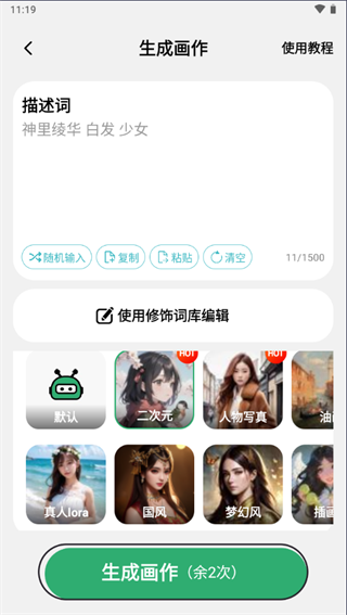 2、在【生成畫作】頁(yè)面,填寫描述詞,使用修飾詞庫(kù)編輯,選擇畫作風(fēng)格、形狀、圖片效果;以上設(shè)置完成后,點(diǎn)擊【一鍵生成】;