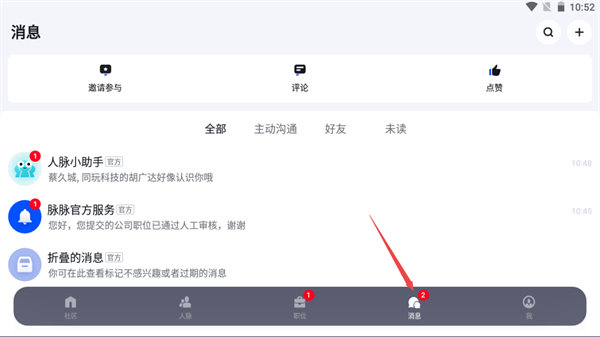 1、進入脈脈應(yīng)用后在【消息】頁面點擊右上角【+】;