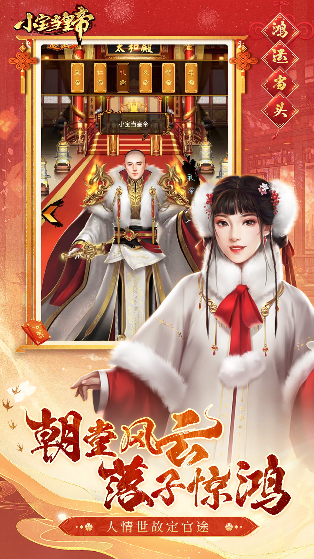 小寶當(dāng)皇上是一看模擬經(jīng)營游戲,這款游戲的畫面感融入古風(fēng)題材進(jìn)行設(shè)計(jì)讓游戲更加具有美感,在游戲中玩家們將扮演皇帝,作為一代帝王,需要管理獎江山,必須要有很多大臣幫助自己進(jìn)行輔政治,在游戲中有豐富的劇情可以進(jìn)行體驗(yàn),每天上線還能領(lǐng)取大量的資源,并且角色的選擇也很多,感興趣的玩家們抓緊時(shí)間下載安裝吧!