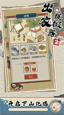 4、開啟化緣:下山化緣,便有機會獲得豐富的道具和相關(guān)事件,從而更好的建設(shè)寺廟。