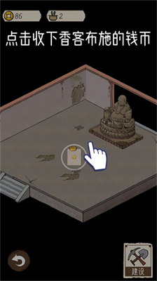 2、耐心等待香客進(jìn)入天王殿內(nèi),面對破爛不堪的天王殿內(nèi)部,可以點擊【建設(shè)】按鈕來改善天王殿的環(huán)境。