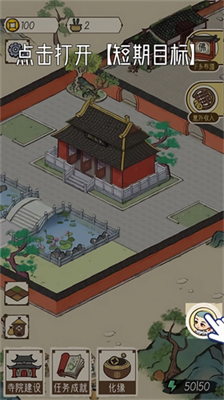 5、如果玩家當(dāng)下不清楚該干嘛就可以打開【短期目標(biāo)】,通過里面的任務(wù)引導(dǎo),完成寺廟的重建,并持續(xù)發(fā)展。