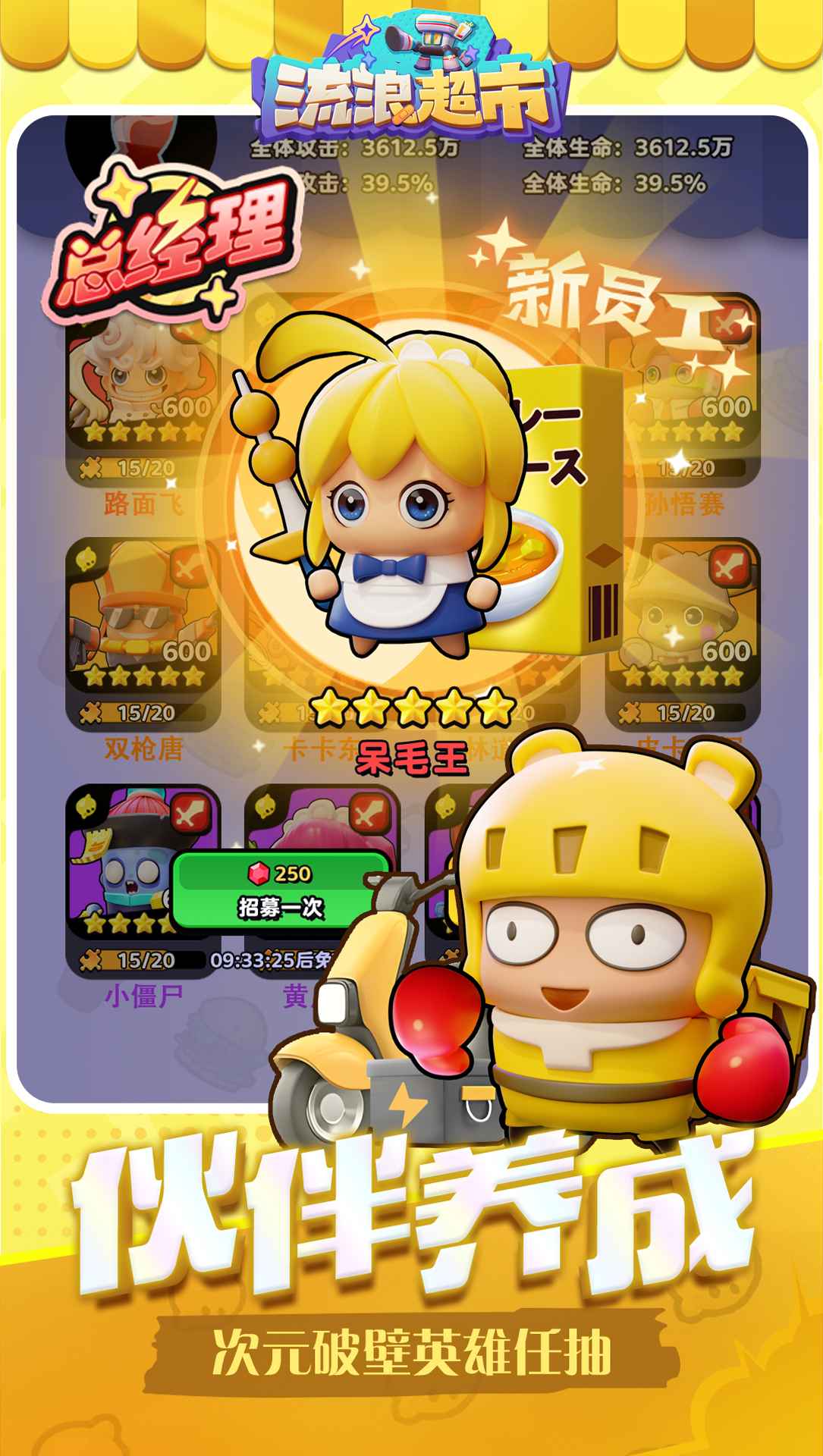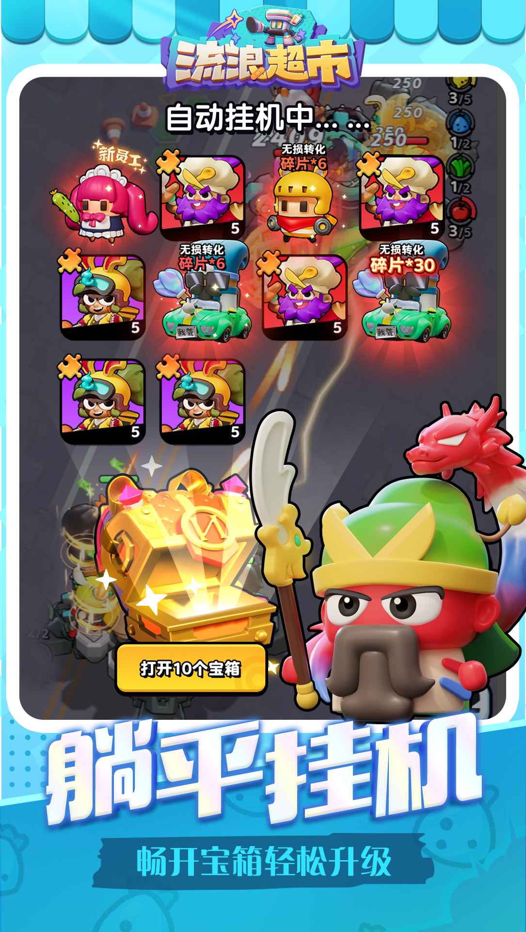 3、養(yǎng)成系統(tǒng):通過收割獎勵、提升超市等級和培養(yǎng)英雄,玩家可以不斷提升自己的實力和游戲體驗。