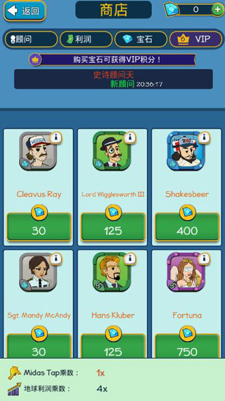 3、游戲中我們不僅僅可以用金錢去購買更多的商業(yè)用地來提升自己賺錢的速度,還可以招聘一些管理人員,它們往往自帶屬性,可以讓我們的財富收益成倍增加。游戲加入了“商業(yè)顧問”,其實也就當APRG中比較常見的寵物,可以增加玩家的屬性,讓我們的利益可以最大化。這些商業(yè)顧問分為五個等級,我們可以選擇三名商業(yè)顧問來幫助自己,如何選擇就看玩家們自己的需求了,這種招聘的方式讓玩家們能有更多選擇和組合的想法,多方位思考自己的商業(yè)帝國所需要的人才,培養(yǎng)作為真正商業(yè)大亨的領(lǐng)導能力。