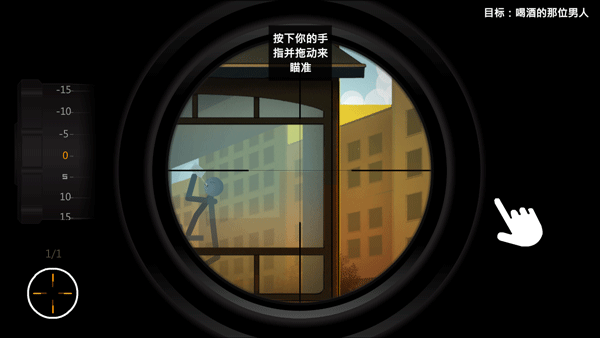 1、打開(kāi)鷹眼鷹眼4火柴人狙擊漢化版游戲,瞄準(zhǔn)目標(biāo),按住瞄準(zhǔn)框,進(jìn)行拖動(dòng)