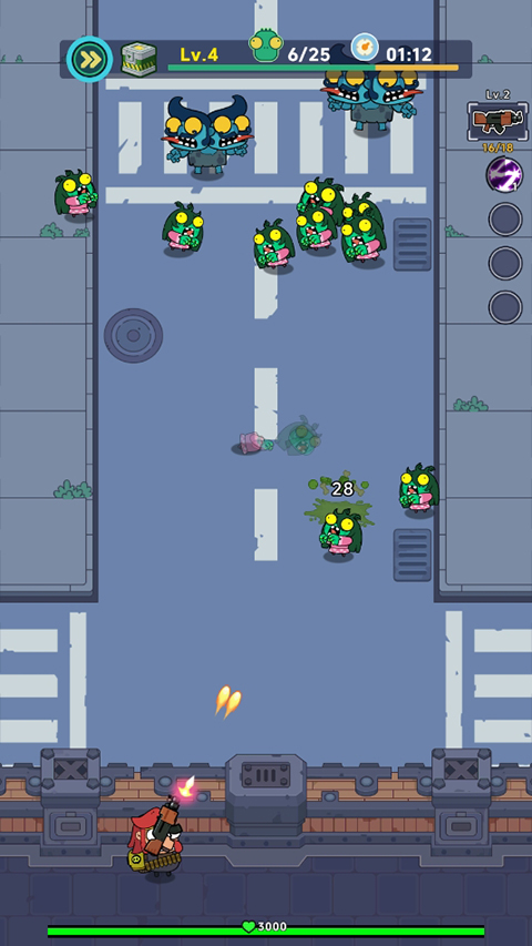 4、游戲融合了割草元素,讓你在成群結(jié)隊的僵尸中殺出一條血路,感受無盡戰(zhàn)斗的刺激與爽快。