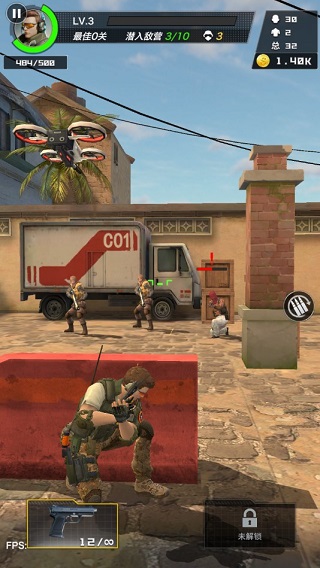 操作方面非常簡(jiǎn)單,玩家按住屏幕即可喚出虛擬搖桿,向指定方向滑動(dòng)并對(duì)準(zhǔn)敵人便可自動(dòng)進(jìn)行攻擊。按鍵攻擊松手以后,角色便會(huì)自動(dòng)躲藏,藏匿與附近的障礙物下,防止被敵人攻擊。