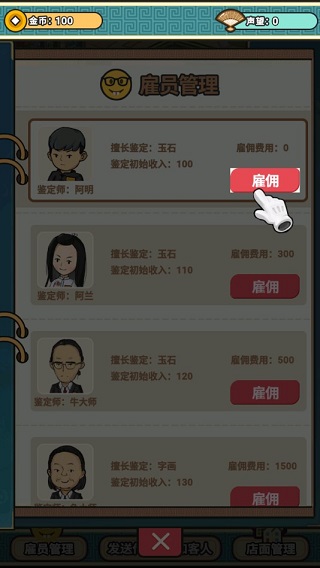 那么接下來先招募一位優(yōu)秀的鑒寶師傅吧!點(diǎn)擊左下方的“雇員管理”。
