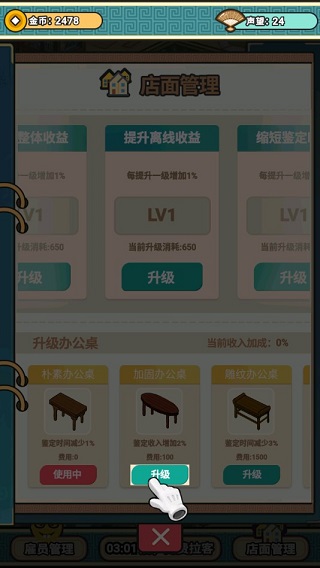 最后,讓我們了解一下店面管理,在店面管理中可以升級(jí)辦公桌,點(diǎn)擊“店面管理”。