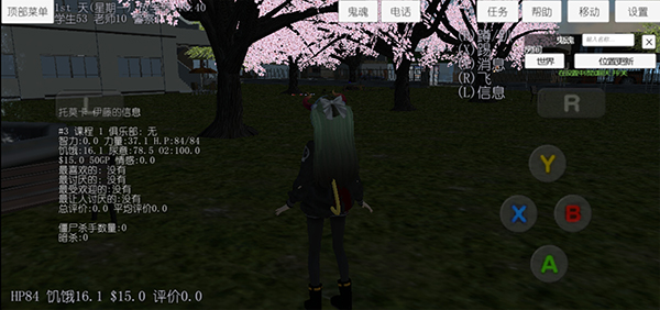 玩法:很普通的玩法,無僵尸模式,照著課表上課,吃東西,上社團(tuán)活動(dòng),加入或退出社團(tuán),和學(xué)生老師互動(dòng),攻略學(xué)生并和學(xué)生戀愛,爬山玩水,開車等。