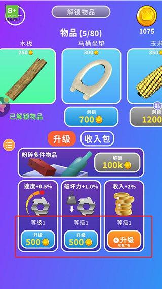 7、另外還可以升級粉碎機的速度、破壞力和收入以達到最高的粉碎性能!