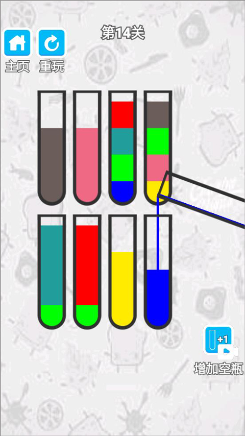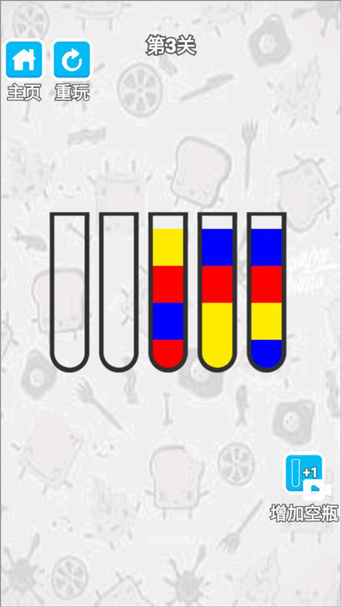 2、玩家點擊瓶子將同一顏色的液體放到一個瓶子里;