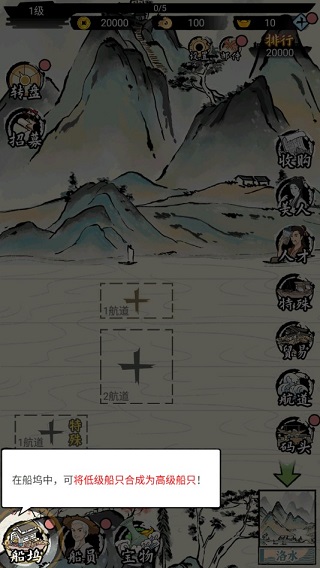 我在古代有船隊手游是一款結(jié)合了國風(fēng)元素模擬經(jīng)營類游戲,游戲中玩家要扮演一位古代商人,經(jīng)營貿(mào)易利用水路進(jìn)行商品的運輸和交易,游戲一開始,玩家要購買船只,通過合成升級船只,提高運輸效率和貨物裝載量增加利潤,喜歡的朋友歡迎下載試玩。