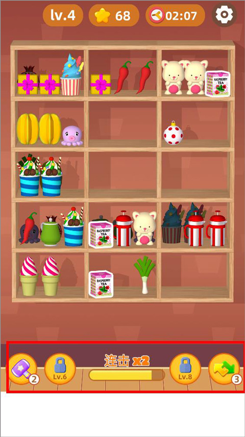 2、進(jìn)入游戲,玩家需要找到相同的物品把他們放到一個(gè)貨架上即可消除;