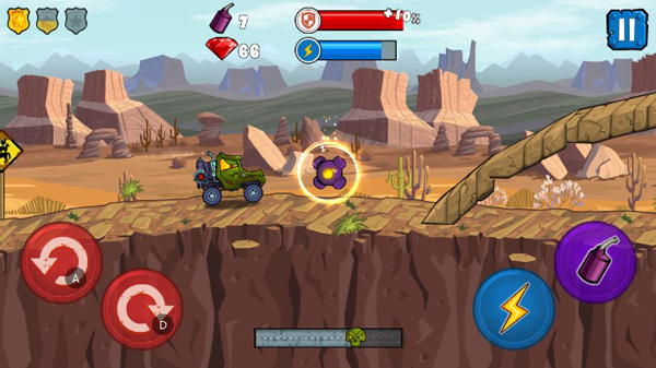 針對于游戲的玩法來說,其實還是比較簡單的,左側(cè)主要控制著賽車的重心,右側(cè)以加速和炸彈釋放為主,期間關(guān)卡中還有許許多多的障礙和路道設(shè)計,讓每一關(guān)都盡顯特色。