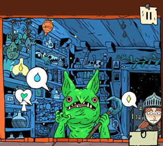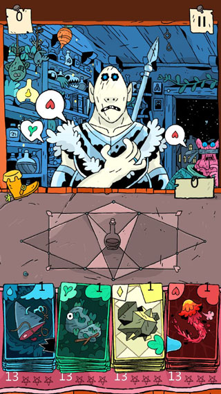 學(xué)會(huì)制作藥水之后,接下來(lái)玩家便可開啟商店完成營(yíng)業(yè)了,記住來(lái)到這里的每個(gè)客戶都有特殊的訂單,其中上面的文字泡泡顯示了它想要的藥水原料,你必須至少使用1張客戶想要的配料卡,否則游戲結(jié)束,