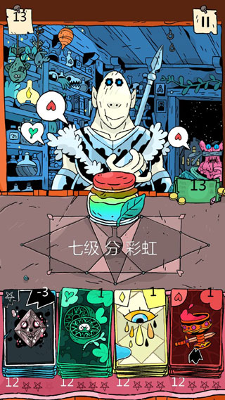 前來(lái)買藥水的顧客所提出的要求就一個(gè),那就是藥水中的成分必須要有某種顏色的元素,也就是對(duì)應(yīng)某種顏色的卡牌,所以在配置的時(shí)候必須滿足顧客的要求。此外這里還有藥水效力一說,這就牽扯到卡牌的數(shù)值加減了,在卡牌下方的左右兩邊和底部會(huì)出現(xiàn)某種顏色標(biāo)記,意思就是如果你能夠在對(duì)應(yīng)的方向放置對(duì)應(yīng)顏色的卡牌,那么就會(huì)獲得數(shù)值也就是藥效加成,也就是說在保證顧客所需元素不缺失的前提下,通過合理的排布來(lái)提升藥效才是玩家最應(yīng)該追求的,當(dāng)然,藥效越高,顧客給予我們的回報(bào)也會(huì)越多。