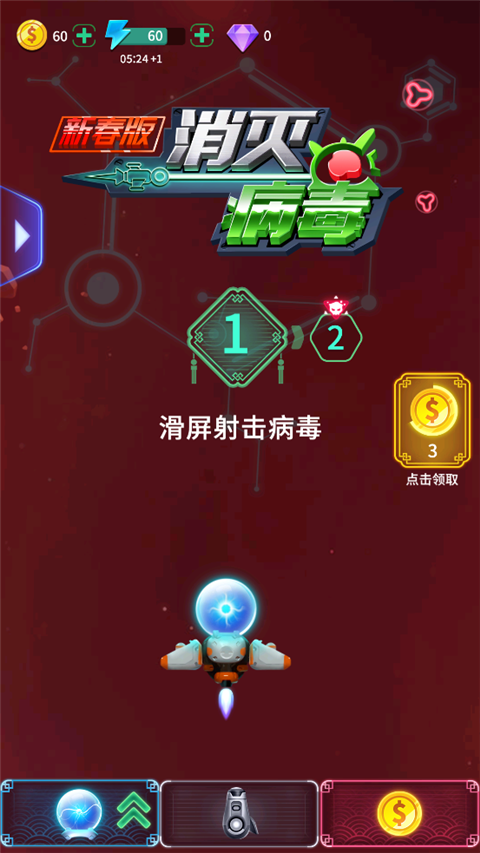 1、進入游戲后,在左上方可以看到當前金幣的數(shù)量,新春版看起來也是非常的喜慶的,滑屏射擊病毒即可開始游戲。