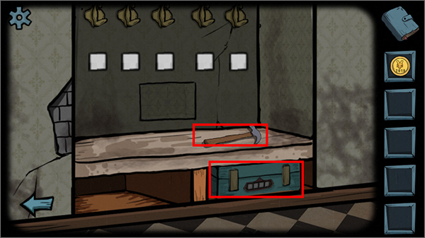 1、先進(jìn)入左側(cè)的門,取錘子和密碼箱。