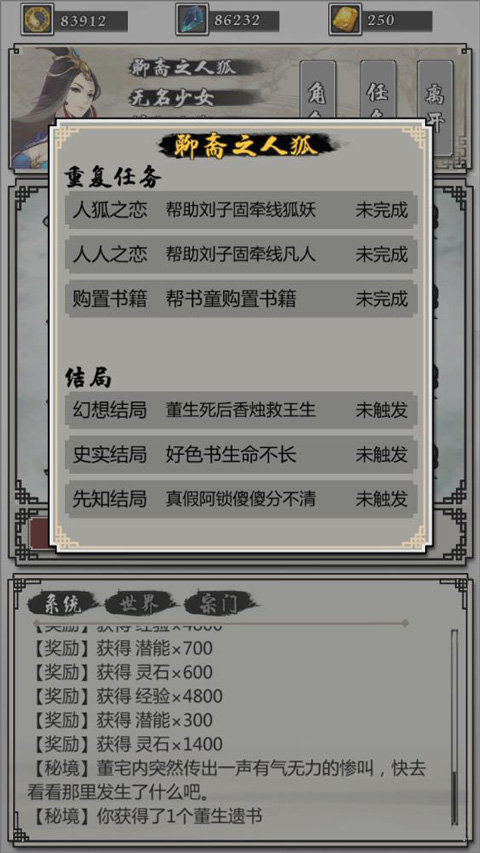 1、人狐之戀:對(duì)話劉子固后,到荒園對(duì)話阿繡選擇:是→不是→天理有誤,后返回劉宅對(duì)話劉子固完成。
