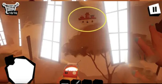 第一個(gè)玩偶在門口左手邊的黃色桶上面。跳上邊上的石頭,然后就可以再跳上桶上面。