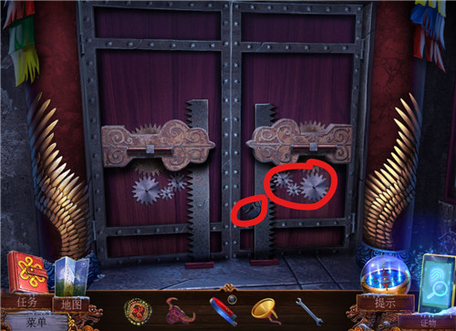 2、赤色門,用雪撬當門閂擋在門后。撿刷子,用刷子刷齒輪,得齒輪。安大門右半邊上。