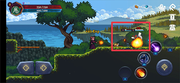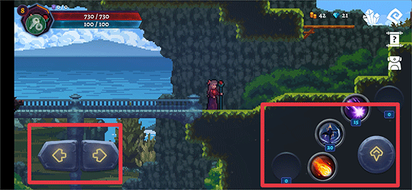 1、進入游戲后,利用左下角左右按鈕操控角色的移動,右邊向上按鈕為跳躍,其他按鈕分別為角色的技能