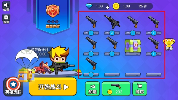 每次戰(zhàn)斗都會(huì)有大量金幣或鉆石獎(jiǎng)勵(lì),在主界面中合成系統(tǒng)中用金幣購(gòu)買武器,每?jī)煞N相同等級(jí)的武器便可進(jìn)行合成升級(jí),升級(jí)之后武器的威力和外形都會(huì)發(fā)生變化。