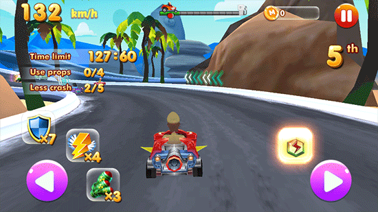 2、在行駛過(guò)程可以任意點(diǎn)擊左右控制鍵旁邊的火箭、箱子等特殊技能進(jìn)行加速、變形,超越其他賽車。