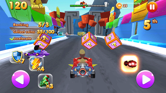 3、玩家還可以通過(guò)撞擊路上標(biāo)著問(wèn)號(hào)的箱子獲得特殊道具,有了道具加持,贏得冠軍簡(jiǎn)直so easy!