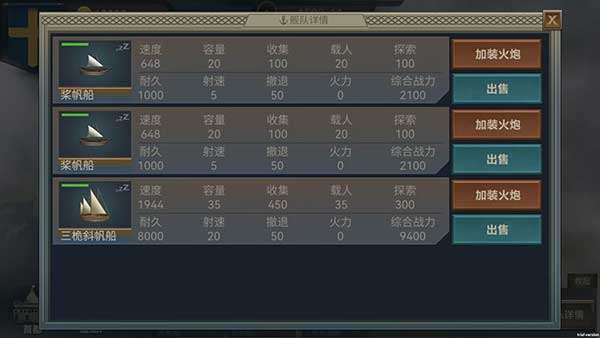 6、在“艦隊(duì)詳情”中可查看已擁有的戰(zhàn)艦的具體信息,還可以給戰(zhàn)艦加裝火炮或是一鍵出售,在“造船廠”可以用金幣建造更厲害的戰(zhàn)艦哦。