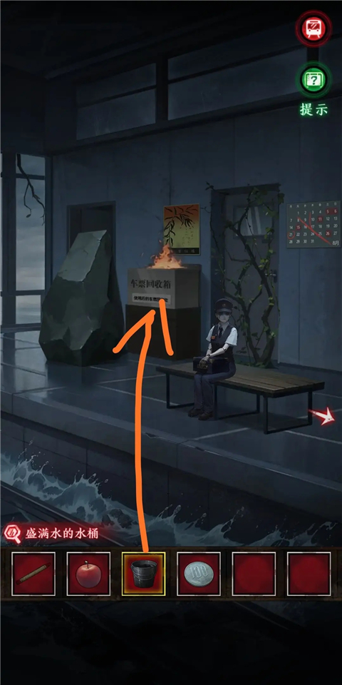 8、撿起水桶,到站臺(tái)裝滿水,對(duì)著火的車票回收箱使用,連線,得到黑蠟筆和空水桶