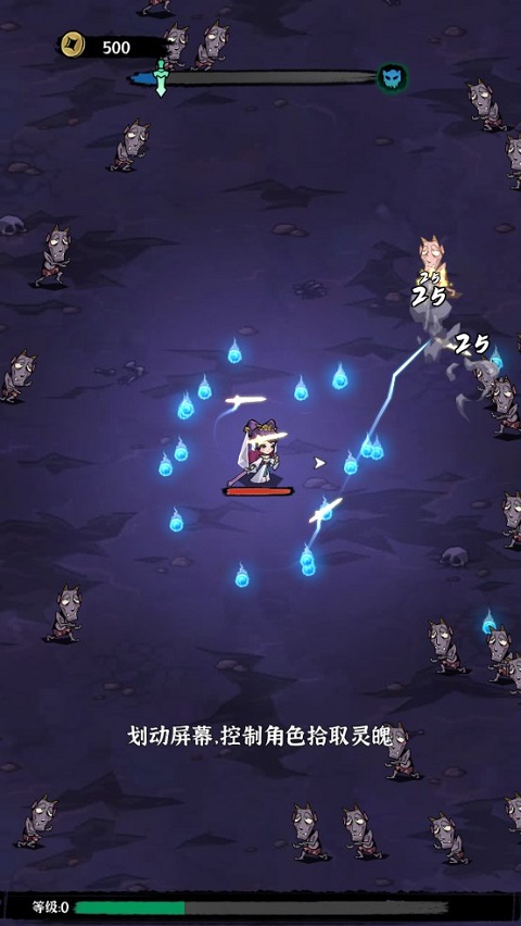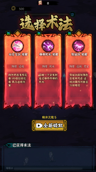 4、敵人死亡后會掉落經(jīng)驗,拾取后可提升等級,每次升級可選取一項術(shù)法;