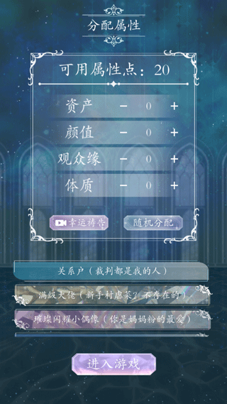 5、進(jìn)行屬性點(diǎn)的分配,屬性點(diǎn)決定了角色的養(yǎng)成方向,每一次事件選擇都會基于屬性點(diǎn)給出結(jié)果