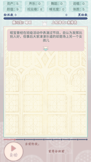重生頂流練習(xí)生官方版是一款超級好玩的文字互動養(yǎng)成游戲,游戲中玩家要扮演懷揣明星夢的練習(xí)生,在追夢路上會面臨各種關(guān)鍵抉擇,每個選擇都將影響未來的發(fā)展軌跡,玩家還要通過明智的選擇來提升各項(xiàng)屬性,合理分配天賦點(diǎn)數(shù),喜歡的小伙伴歡迎到本站下載試玩吧!
