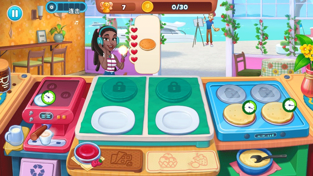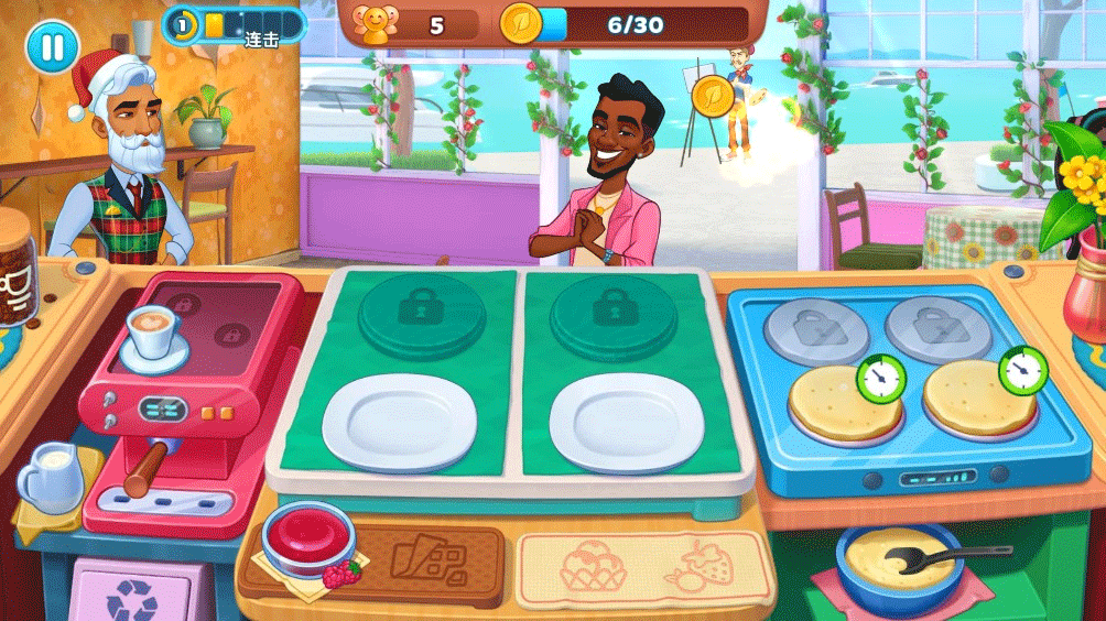3、顧客來店后,玩家需要根據(jù)顧客的訂單制作美食,并需要在顧客的耐心值消耗完之前將正確餐點交給他;