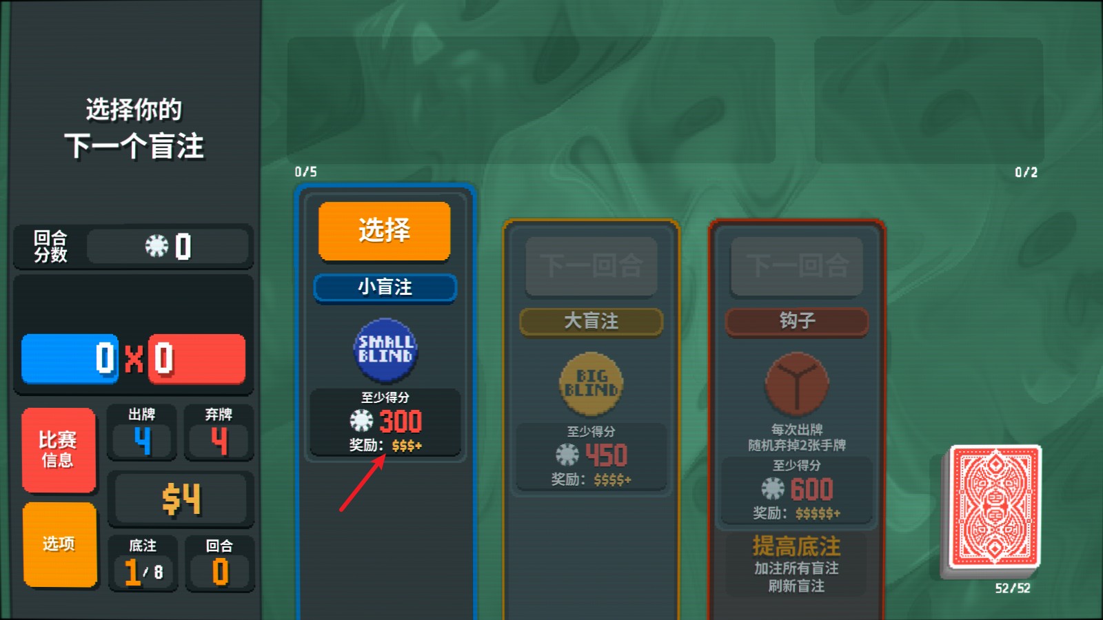 1、每一回合開始前,都需要選擇盲注,也就是需要挑戰(zhàn)的難度。