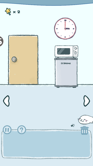 6、從右邊房間的垃圾箱里找到通往左邊的房間的標(biāo)識(shí),從柜子里找到逗貓棒,回到初始房,把通向左邊的標(biāo)識(shí)貼上,從左邊的房間里拿到木板。然后回初始房把管道調(diào)整到合適位置,搭上木板,把沙發(fā)靠背拿下來鋪到地上,用逗貓棒把主子引下來。
