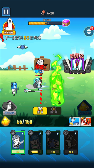 3、同時,還有超大地圖分布著各種關(guān)卡,有滑稽草原、尼瑪山脈、逮蝦沙漠、狗頭島、蝦米海灘和沙雕雪地,這些不同地理位置分別有著不同級別的難度挑戰(zhàn),因此你需要組合搭配更多的兵種來完成世界的統(tǒng)一。