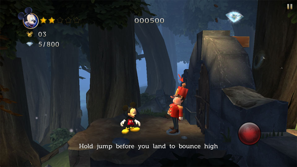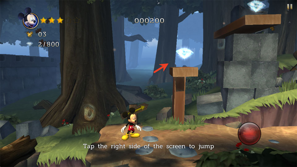2、點擊右邊屏幕即可讓米老鼠跳躍,靈活跳躍能夠幫助你拾取散落在各處的鉆石,積累分數(shù)。