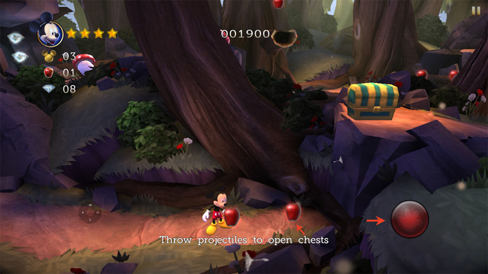 4. 蘋果道具攻擊與彈跳踩踏雙戰(zhàn)斗方式,拾取蘋果后可投擲攻擊敵人,也可踩踏木偶等敵人頭頂進行跳躍位移,無蘋果時依賴踩踏應對